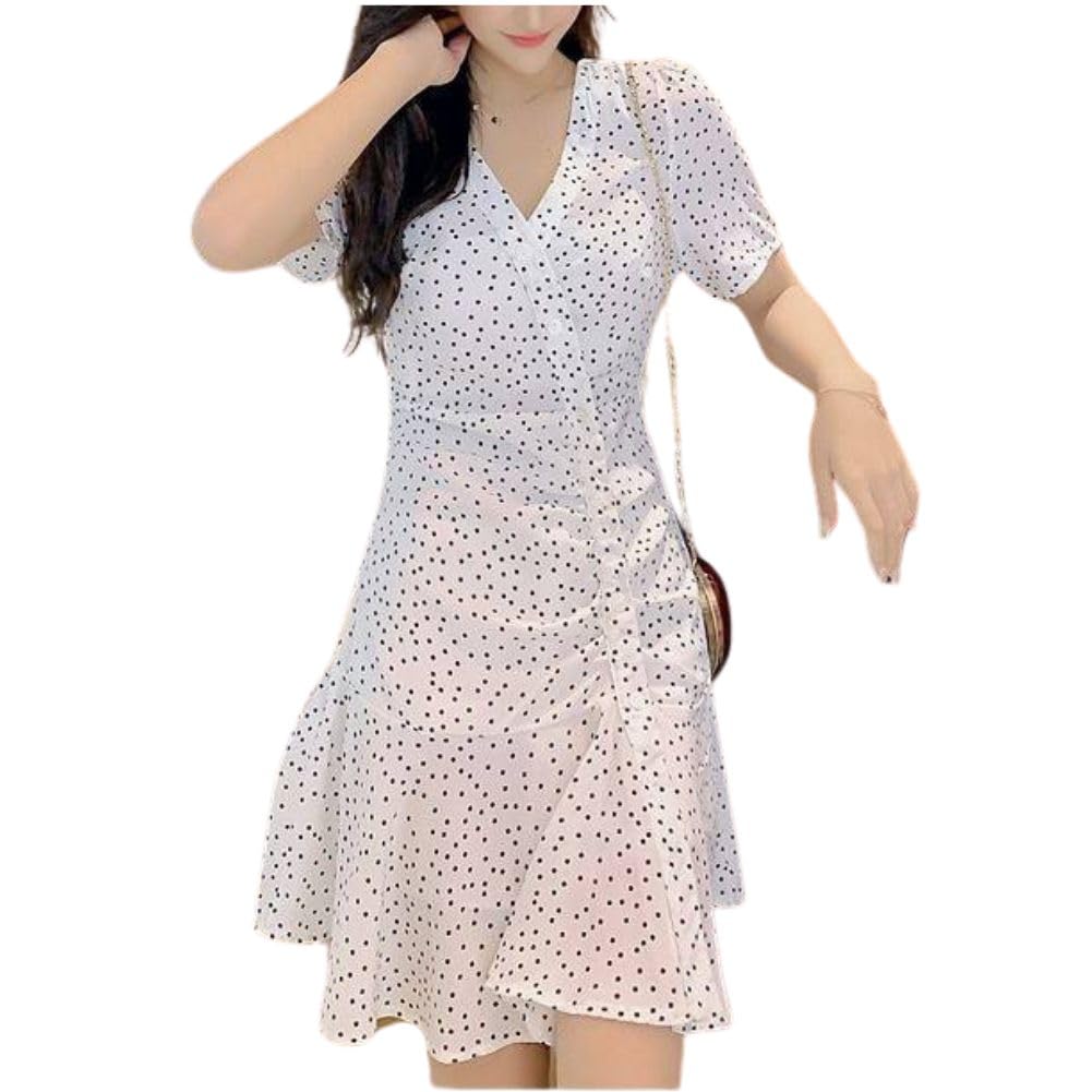 АКВА Морской Шифон Мини В горошек Короткое Мини Летнее Корейский Курортный Стиль Женское Платье, Принт, Рукава, Длина, А-силуэт, V-образный вырез, Расклешенное, Носить, Прохладное, белый