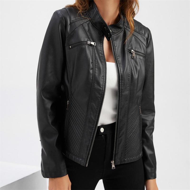 Женская модная кожаная куртка с воротником-стойкой для отдыха, европейская и американская приталенная однотонная куртка