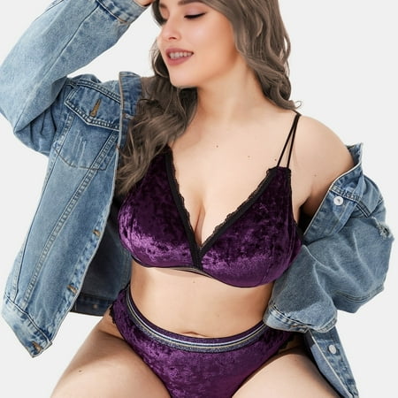 Plus Size Velvet Contrast Lace Bra & Panties Lingerie Set Women‘s Plus Slight Stretch Sexy Underwear Set