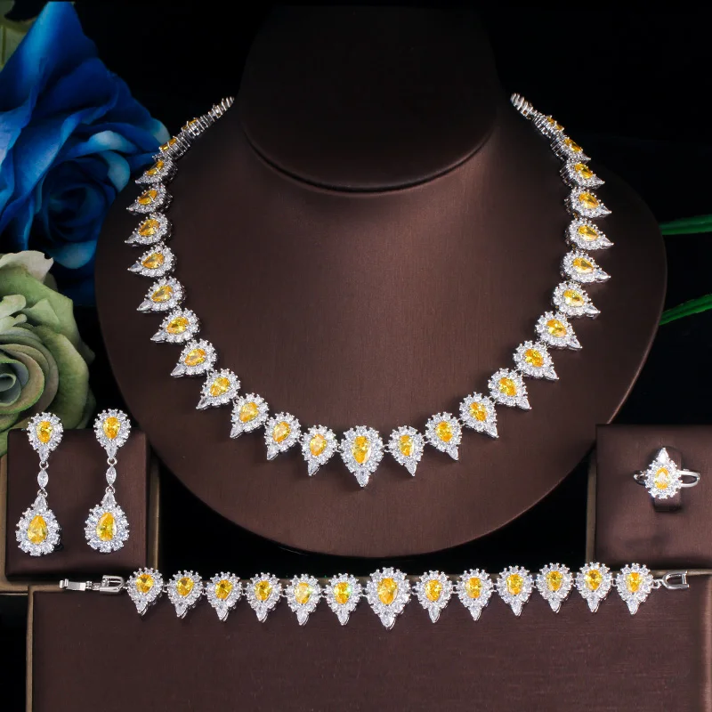 ThreeGraces Luxury Yellow Water Drop Crystal Wedding Brides 4pcs Jewelry Cubic Zircon Bracelets Earrings Big Necklace Sets TZ520