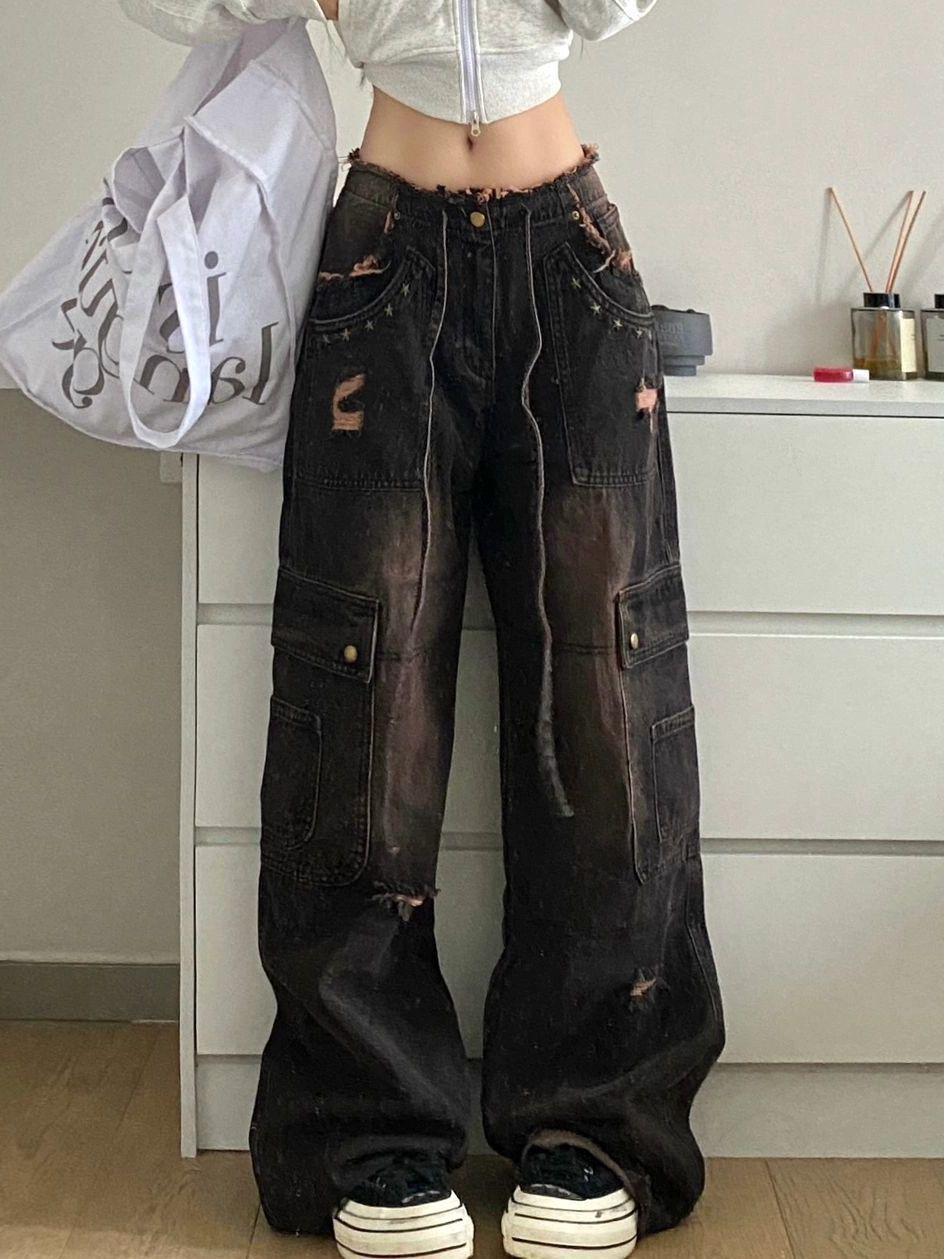 Американские ретро джинсы широкого кроя: Женские брюки длиной до пола, с необработанным краем, прямого кроя, свободные, облегающие Medium промывают черный