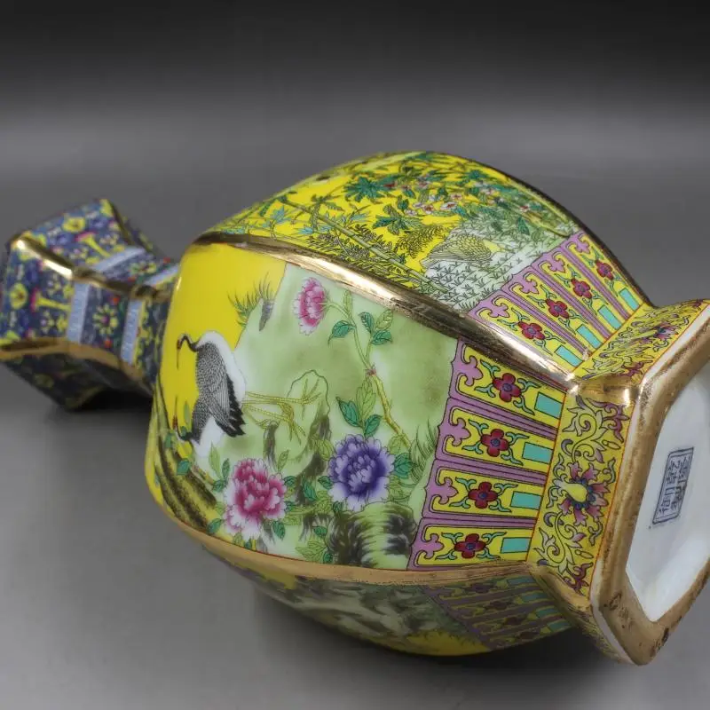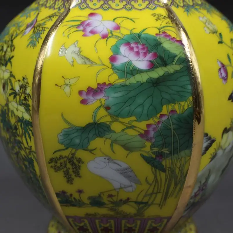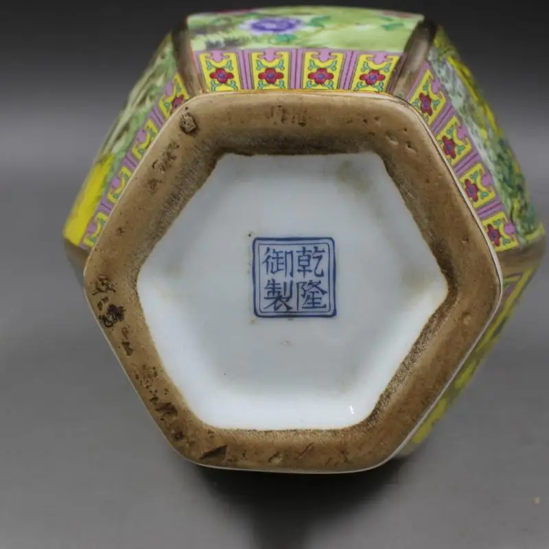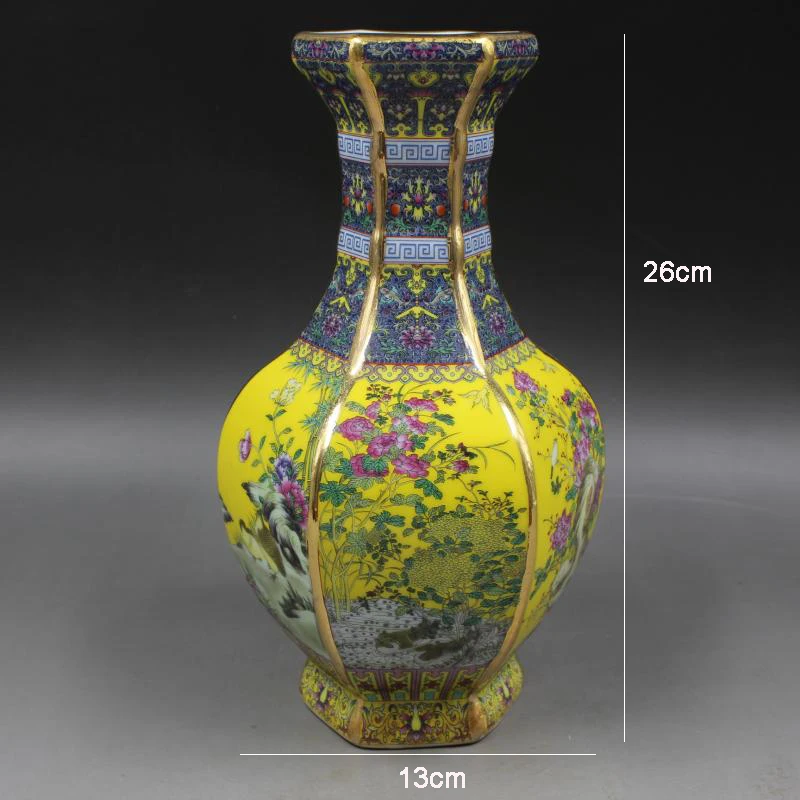 Антикварная желтая керамическая ваза Qing Qianlong, эмалированная позолоченная Шестигранная ваза с цветами, античный фарфор, коллекция древнего ...