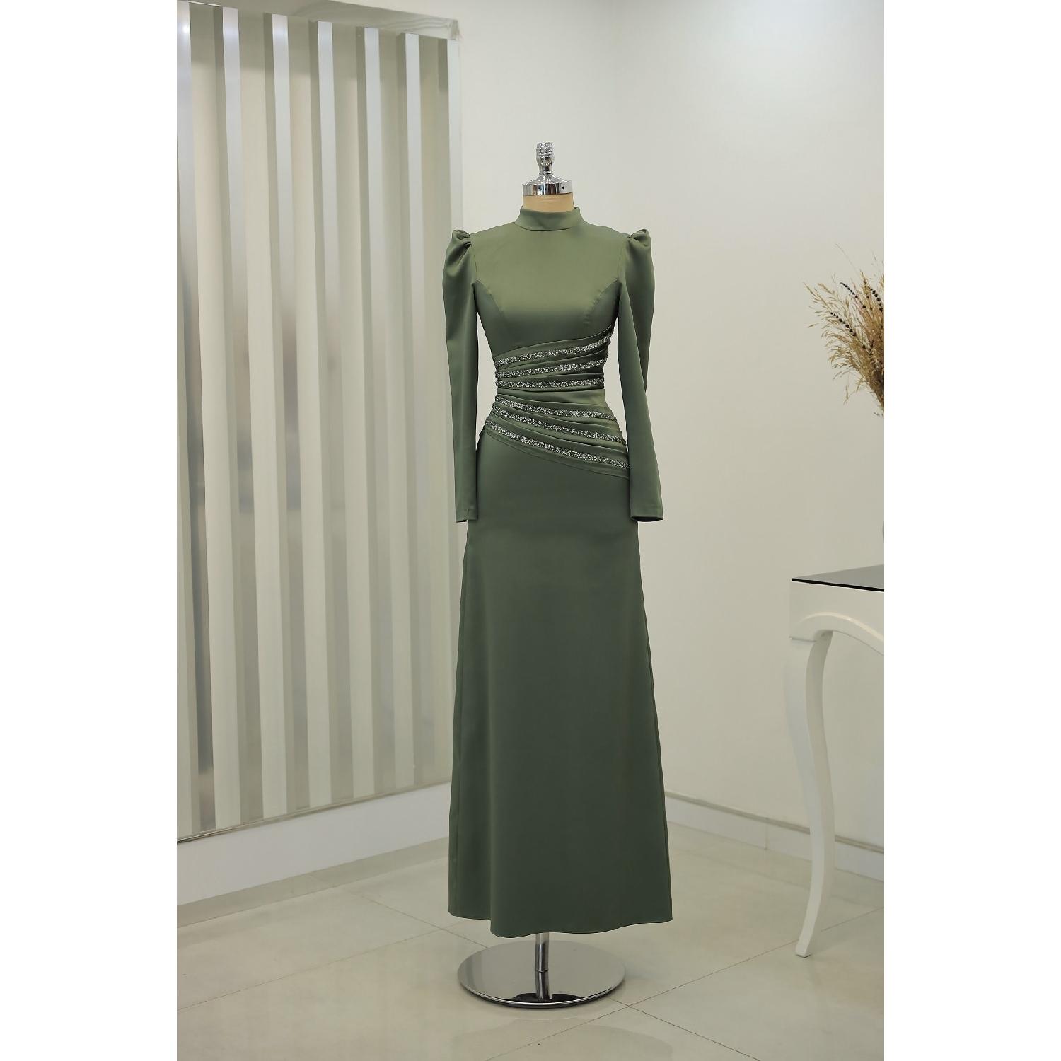 Атласное вечернее платье Hira с драпировкой и камнями цвета хаки