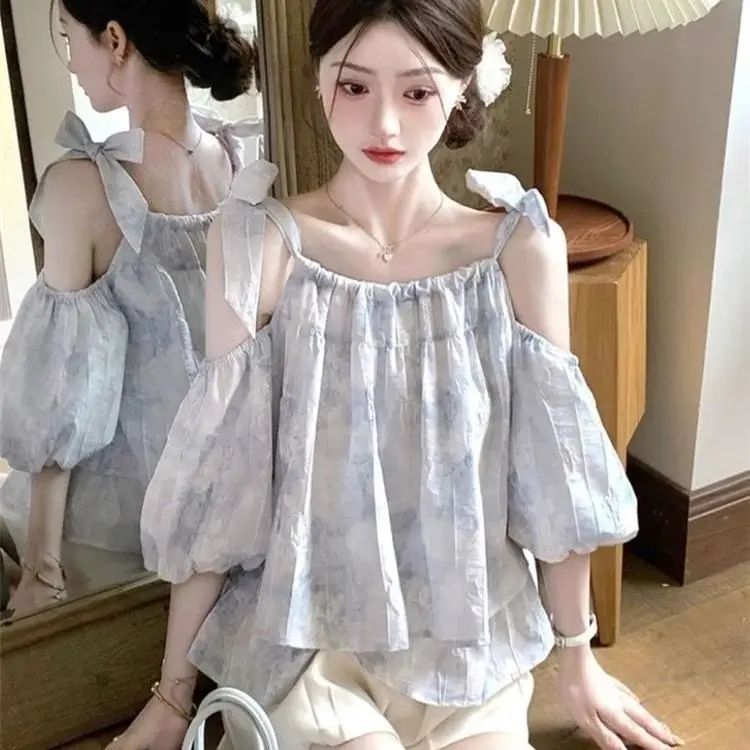 French Sweet Small Fresh Suspender One-shoulder Top for Women in Summer Tie-dye Chiffon Shirt Design Niche
