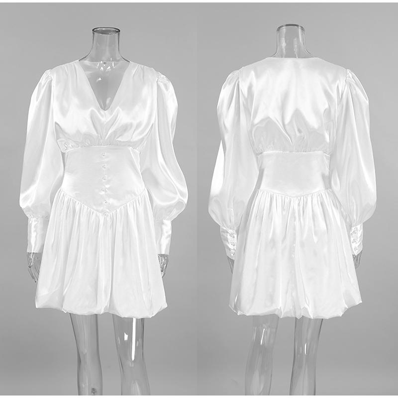 Атласное платье с V-образным вырезом, женское, белое, с высокой талией, элегантное, А-силуэтное, с длинным рукавом-фонариком, роскошный стиль, офисная леди, новая мода M белый