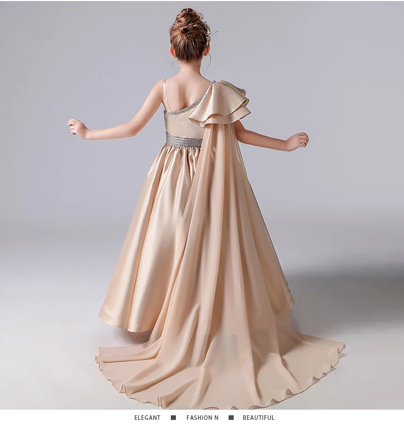 Атласные платья цвета шампанского/белого цветов для девочек, Свадебное бальное платье без рукавов на одно плечо, платье для первого причастия на день рождения