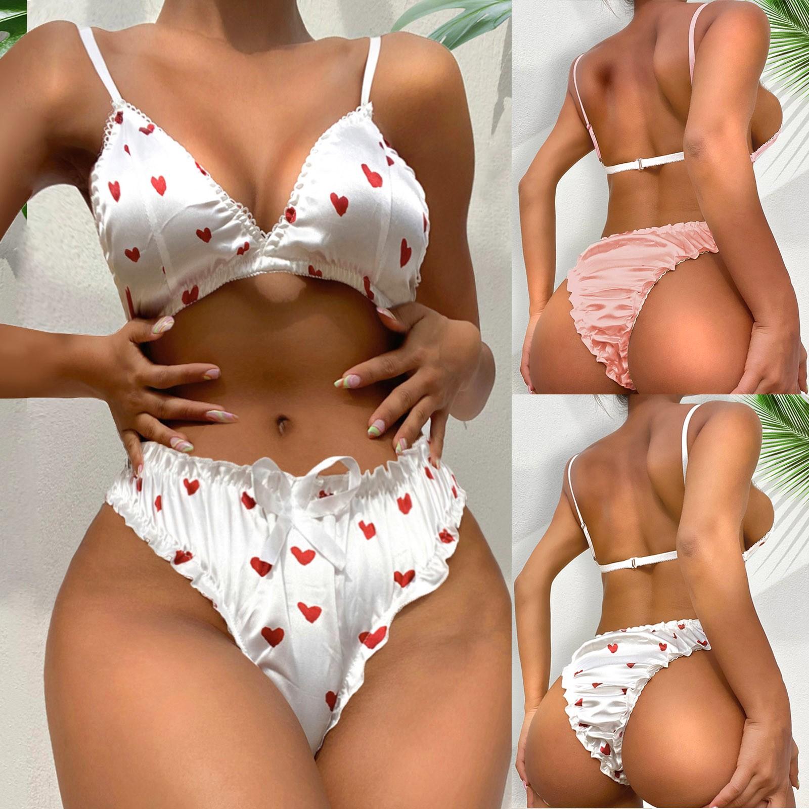 Атласный комплект нижнего белья с принтом сердца, атласная пижама, ночное белье, милый беспроводной бюстгальтер, нижнее белье XL белый