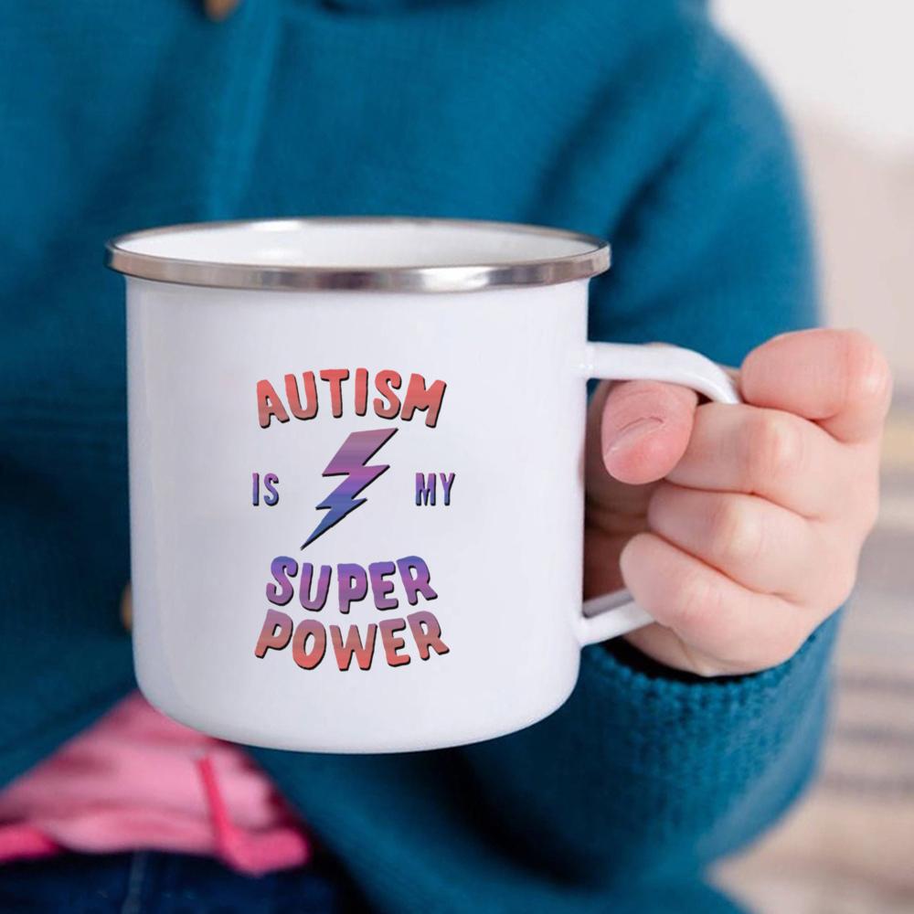 Аутизм — моя суперсила. Чашка-головоломка для людей с аутизмом. Белые ручки. Кружка для кофе и чая. Цветная эмалированная кружка. 360ml