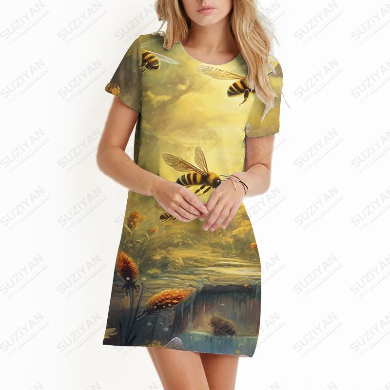 Базовое женское летнее мини-платье для офиса, вечернее платье, женское повседневное свободное платье, платье с принтом пчелы и меда 3D, женская одежда S
