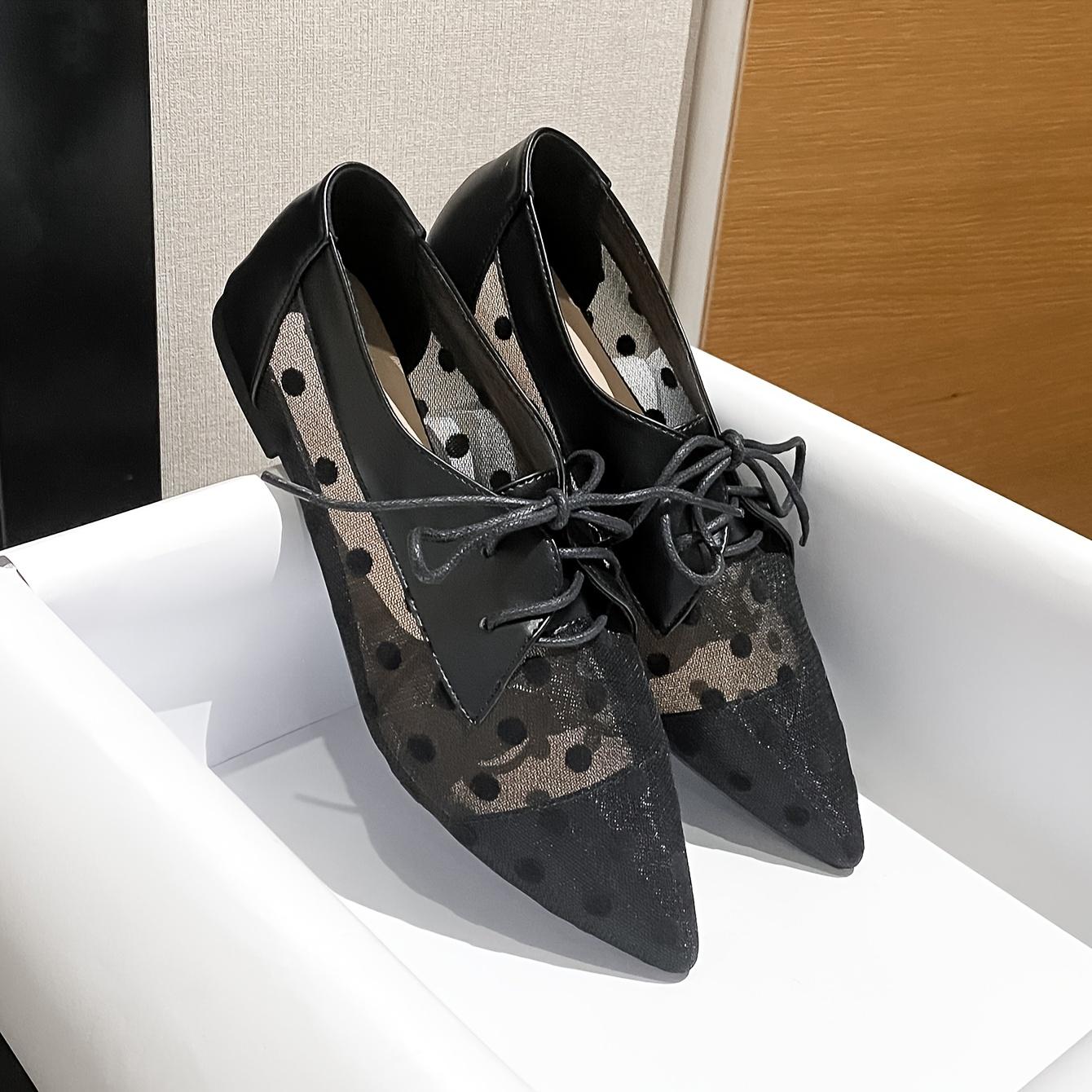 Балетки с острым носком, сетчатые, на шнуровке, плоские, женская обувь, в горошек, дышащие сандалии, большие размеры 35-43 43 чёрный