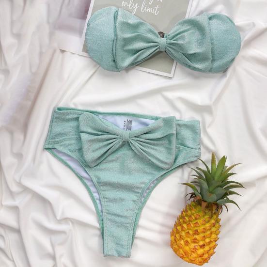 Бант Яркий Шелк Сексуальный Плюс Размер Без Бретелек Бикини Набор Бандо Бюстгальтер Высокая Талия Трусы Сплошной Цвет Купальники