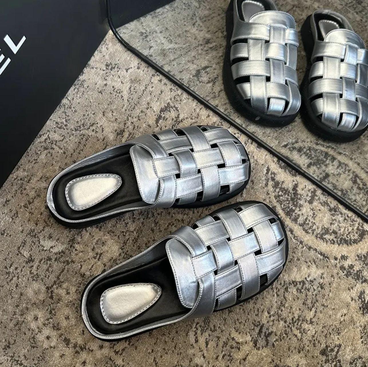 Баотоу тапочки женские 2024 лето новые римские плетеные пляжные туфли полые мягкая подошва ретро полушлепанцы уличные тапочки 40 серебряный