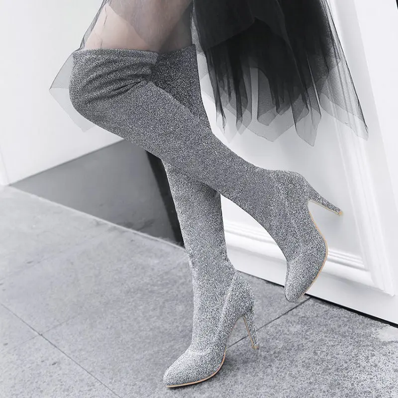 Пикантные блестящие тянущиеся тканевые высокие сапоги QPLYXCO на тонком высоком каблуке синие красные Серебристые высокие сапоги женские длинные сапоги