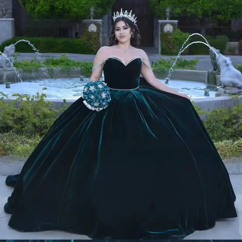 Бархатные зеленые платья Quinceanera 2024, милое вечернее платье на день рождения 15 16, платья для XV, с открытыми плечами, Длинное Пышное платье принцессы