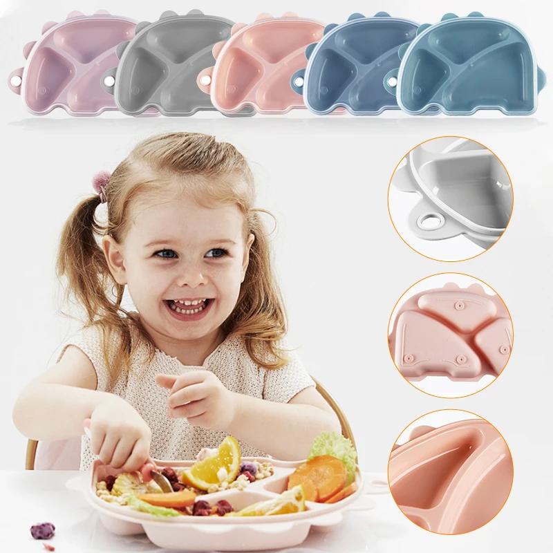Безопасная обеденная тарелка для малышей, однотонная милая детская тарелка с мультяшным динозавром, тарелка на присоске, тренировочная пос...