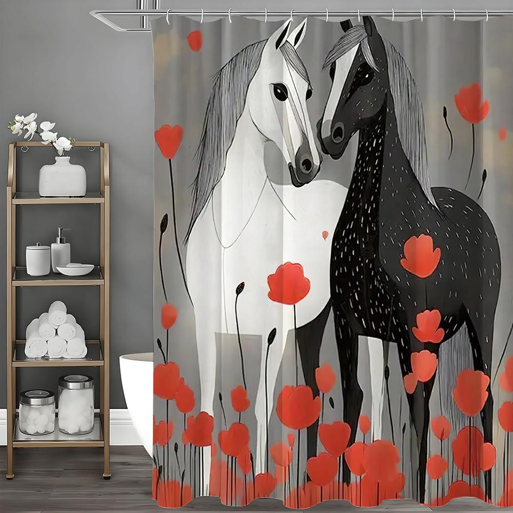 Белая Лошадь Черная Лошадь и Красный Цветочный Занавес для Душа, Декоративный Занавес для Душа для Ванной Комнаты, Водонепроницаемый Занавес для Душа с Крючками 90*180cm