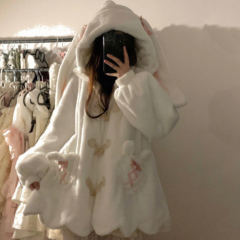 Белая плюшевая толстовка Kawaii, куртка, повседневная, теплая, с капюшоном, с кроличьими ушками, женская, осень-зима, с милым бантом, толстовка, пальто XXL белый