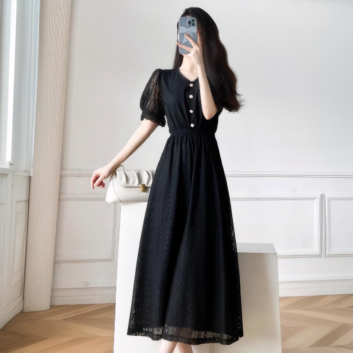Белое кружевное платье для женщин на лето Сказочное супер-сказочное платье с белой юбкой Длинная французская облегающая талию Темпераментная длинная юбка Лето S чёрный