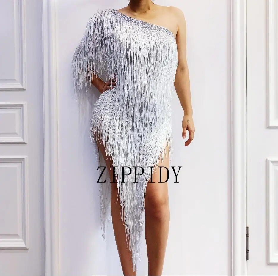 Белое платье с кисточками на одно плечо Стразы одежда для выпускного вечера певец Танцор платье на день рождения праздник платье с бахромой