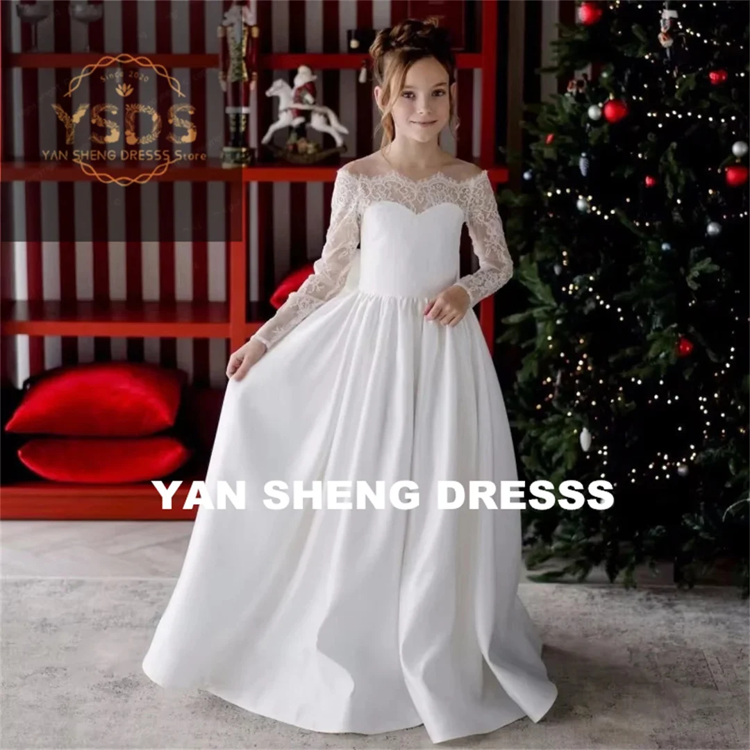 Белые атласные цветочные аппликации на свадьбу, день рождения, с бантом, с длинными рукавами, платья для девочек-цветочниц для вечеринки, банкета, Святого Причастия