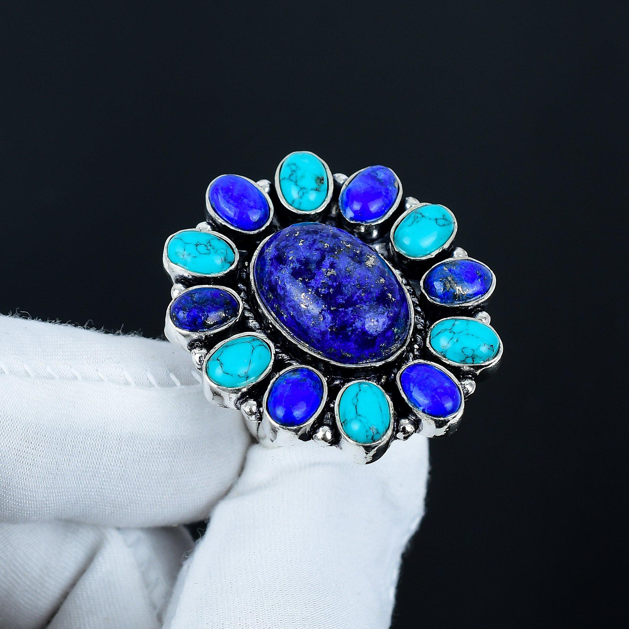 Бирюзовое, Кольцо с драгоценным камнем лазуритом, Кольцо из стерлингового серебра 925 пробы, Подарок для нее, Овальный камень, Элегантное кольцо ручной работы, Серебряное кольцо с цветком из лазурита US 9 синий