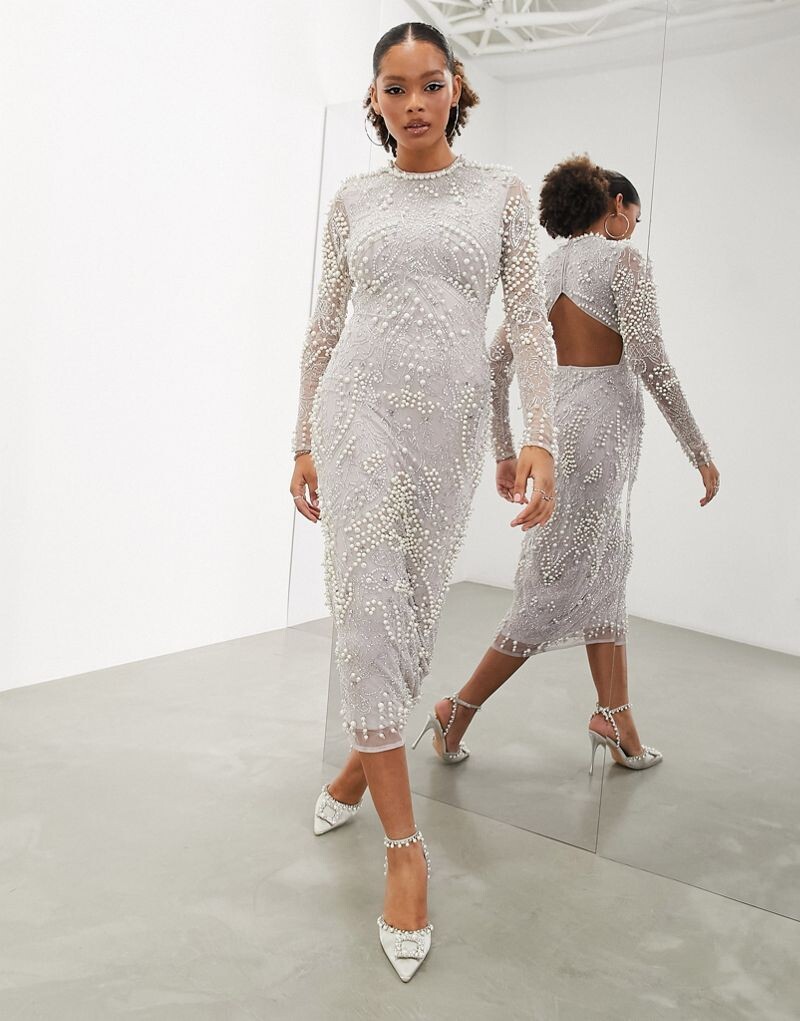 Бледно-серое облегающее платье миди с вырезом на спине ASOS EDITION с жемчужным декором