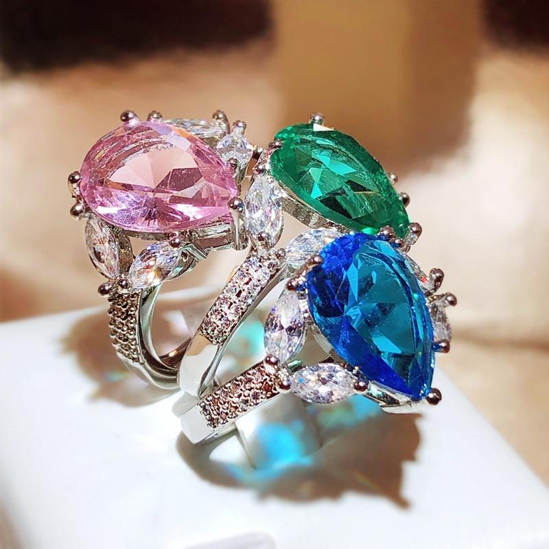 Блестящее женское кольцо в форме большой капли воды, розовое, зеленое, синее, с цирконом, обручальное кольцо для невесты, высококачественное регулируемое кольцо для пары Resizable розовый