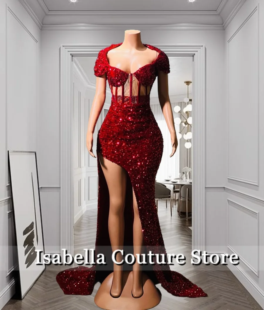Блестящее красное длинное платье для выпускного вечера с разрезом по бокам, банкетные танцевальные платья, платье для дня рождения, велюровое вечернее платье с блестками по индивидуальному заказу