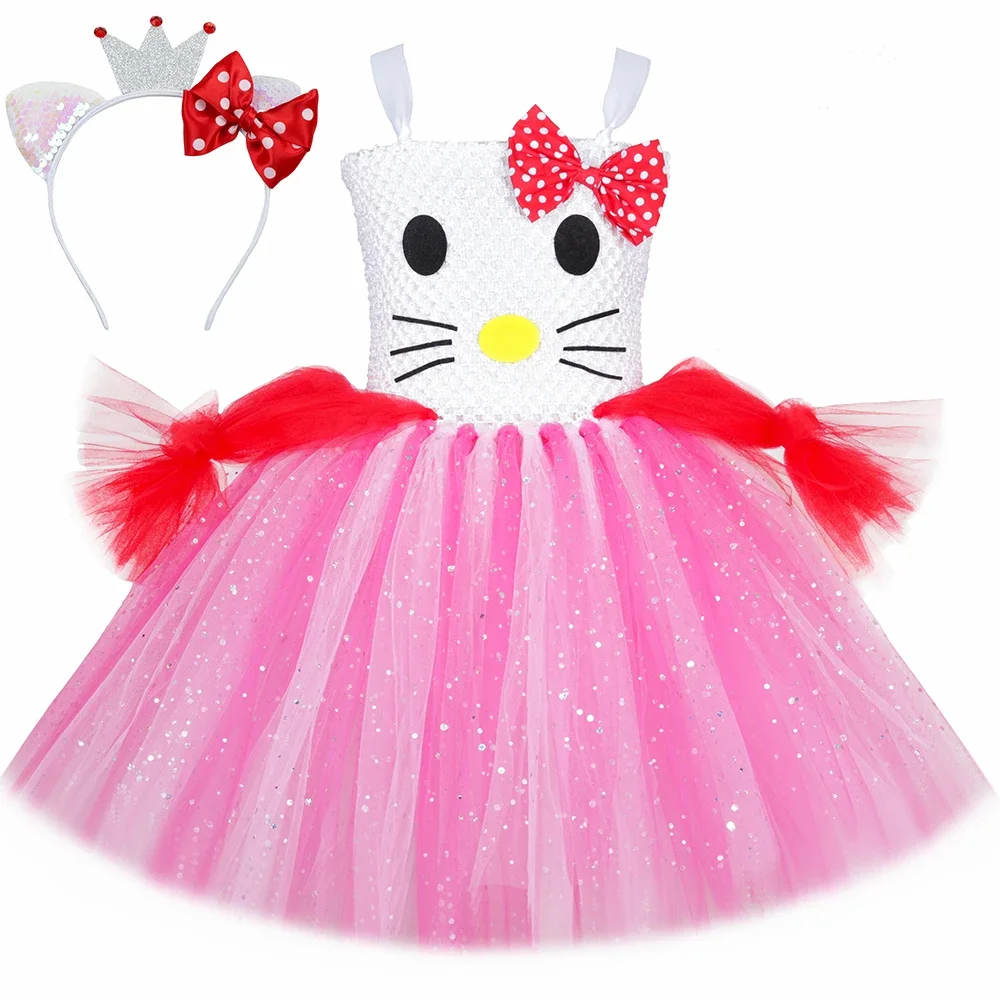 Блестящее платье-пачка с изображением котенка для девочек, вечерние тюлевые платья принцессы на день рождения, бальное платье, розовый костюм с мультяшным котом, детская праздничная одежда