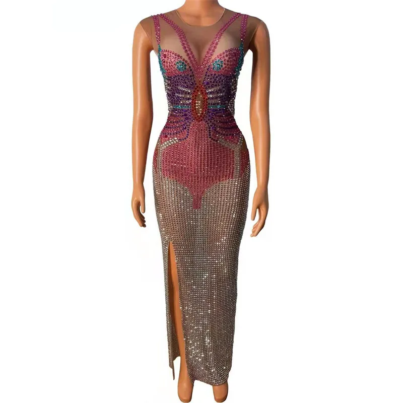 Блестящее прозрачное длинное платье стразы с принтом для вечеринки, дня рождения, костюм певицы, концерта, выступления, вечеринки, шоу, сцен...