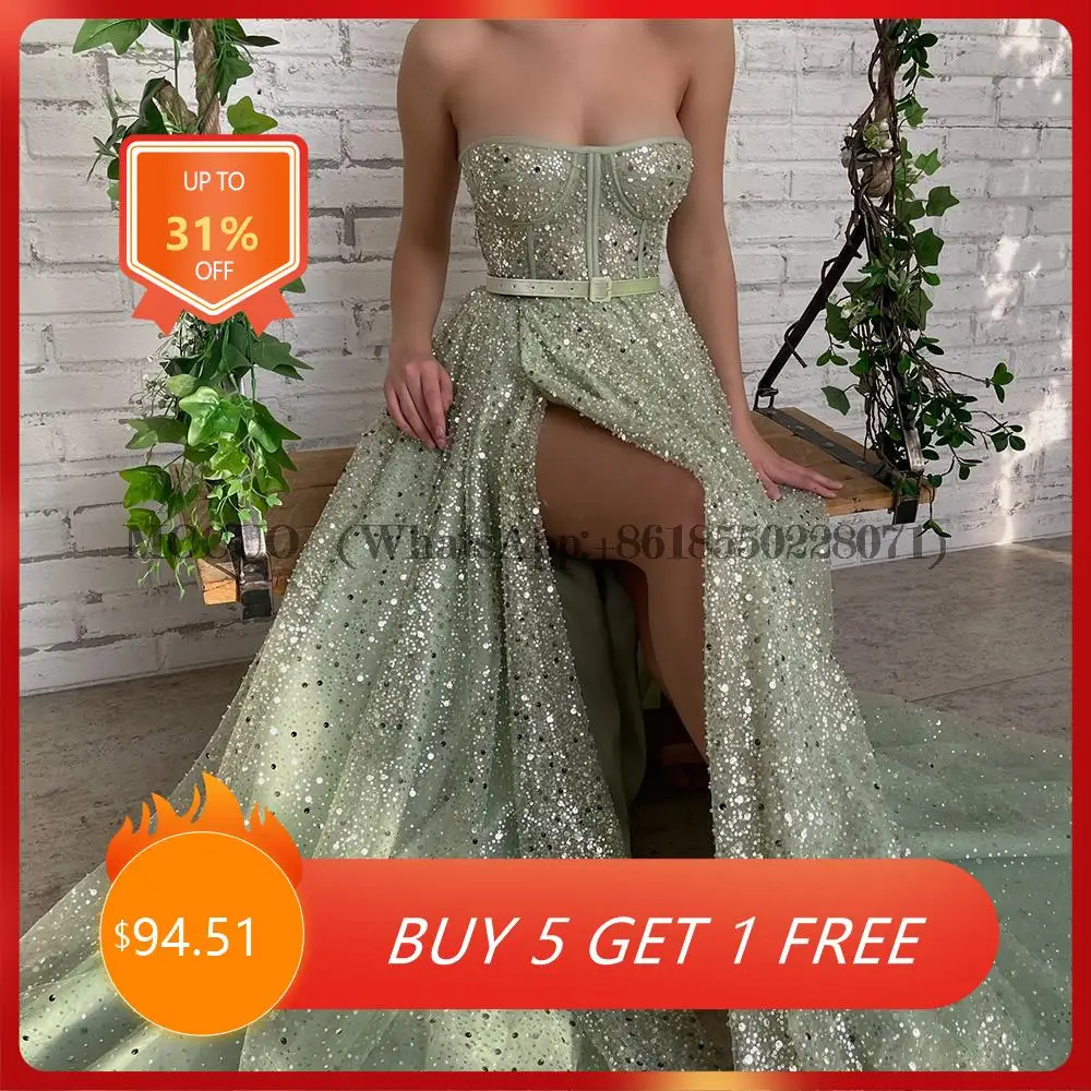 Блестящие Зеленые Длинные вечерние платья 2022, роскошные трапециевидные платья для выпускного вечера, простое вечернее платье без бретелек с разрезом, бальное платье