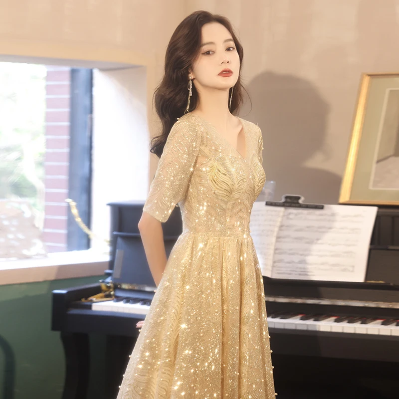 Блестящие золотистые вечерние платья с блестками 2021, элегантное платье-трапеция до пола с V-образным вырезом и бисером, кружевные длинные же...