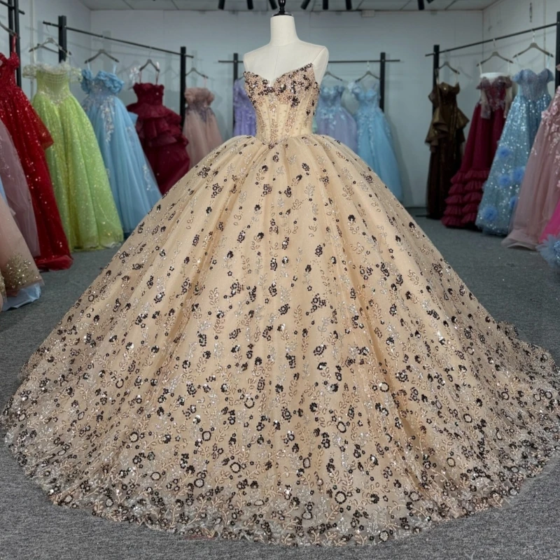 Блестящие платья Quinceanera цвета шампанского с открытыми плечами и блестками, аппликация, кружево, бисер, тюль, бант, вечерние, день рождения, милое платье 16, Vestido