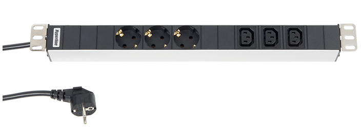 Блок розеток 1U, кол-во розеток: 6 (3xЕвро/3xC13), 16А, черный/серебристый, кабель питания 2.5 м, Hyperline SHT19-3SH-3IEC-2.5EU (SHT19-3SH-3IEC-2.5EU), SHT19-3SH-3IEC-2.5EU