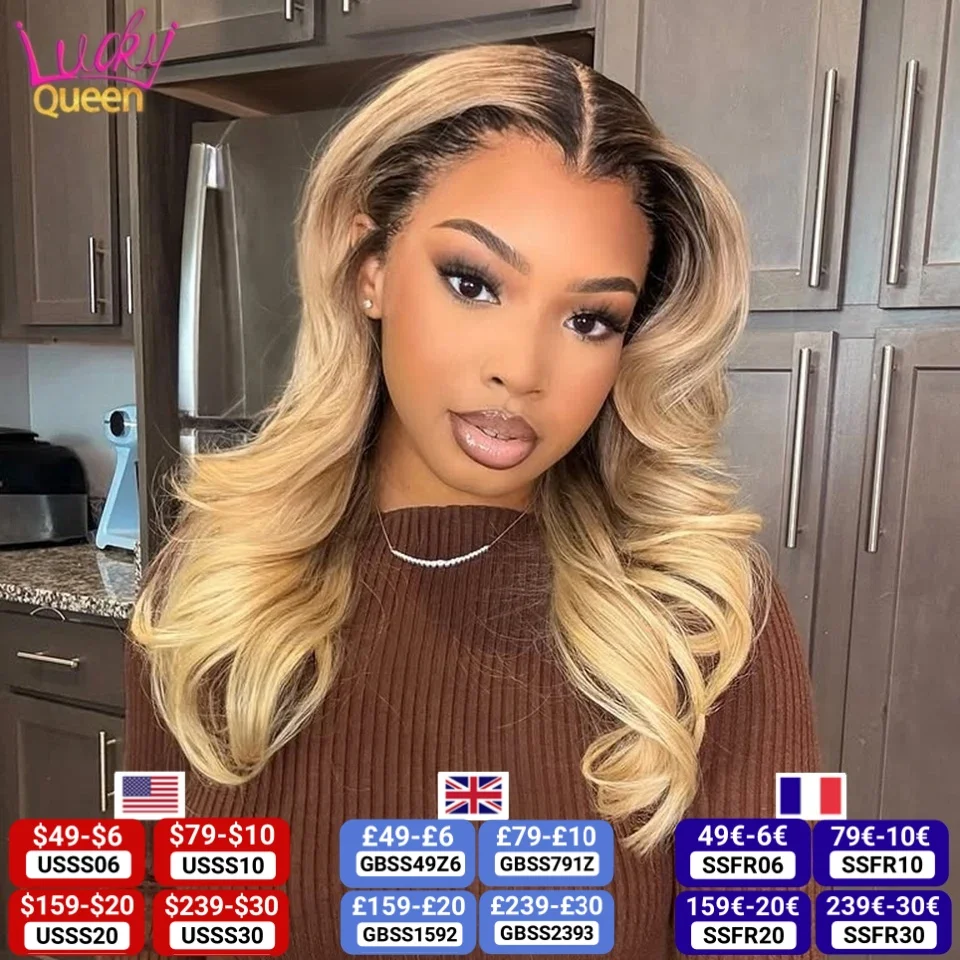 Блондинка с эффектом омбре, темный корень, объемная волна, кружевные фронтальные парики, человеческие бразильские волосы, предварительно выщипанные, плотность 180, прозрачное кружево # 27 для женщин