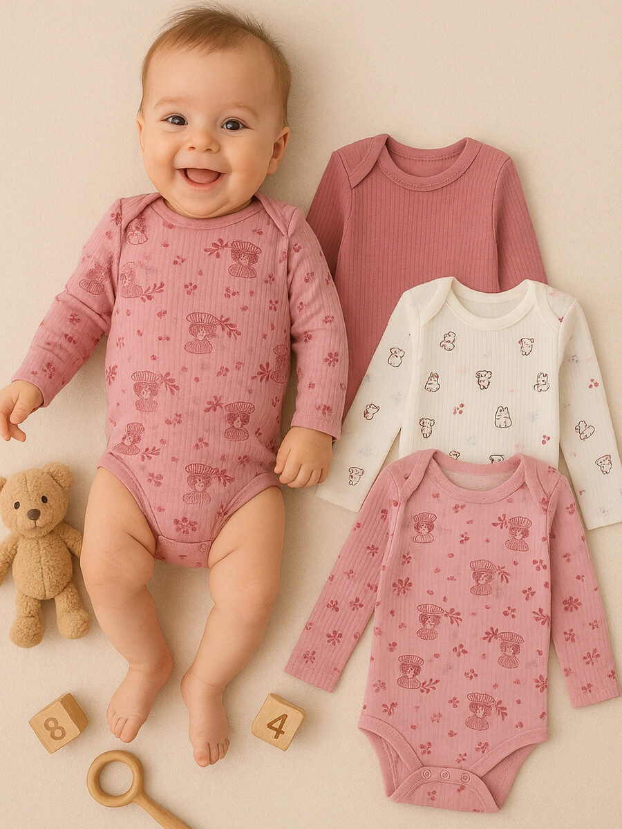 Боди детское в наборе, 3 шт, Белый;розовый;зайчики на зв.белом +цветочные еноты на п.роз +дымч.роза