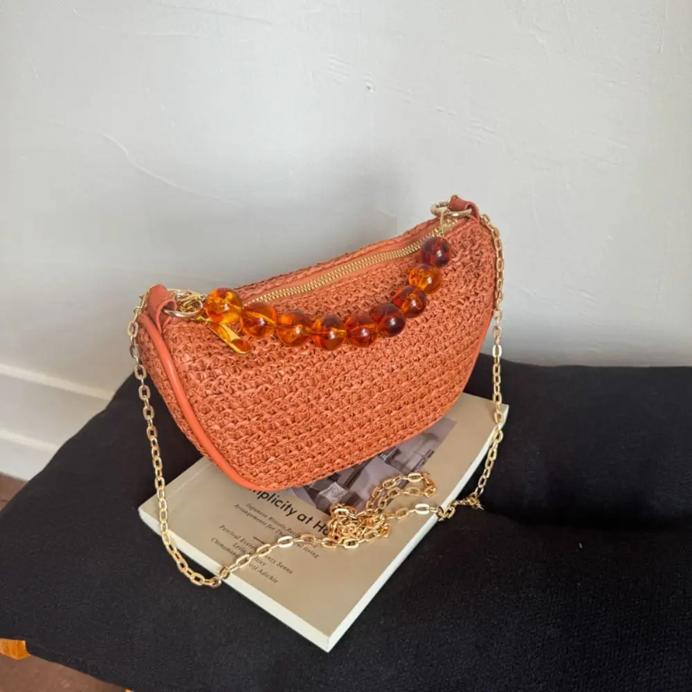 Большая вместительная сумка из травяного плетения, соломенная сумка ручной работы с бусинами и ручкой, стильная модная женская сумка через плечо с металлической цепочкой для отпуска