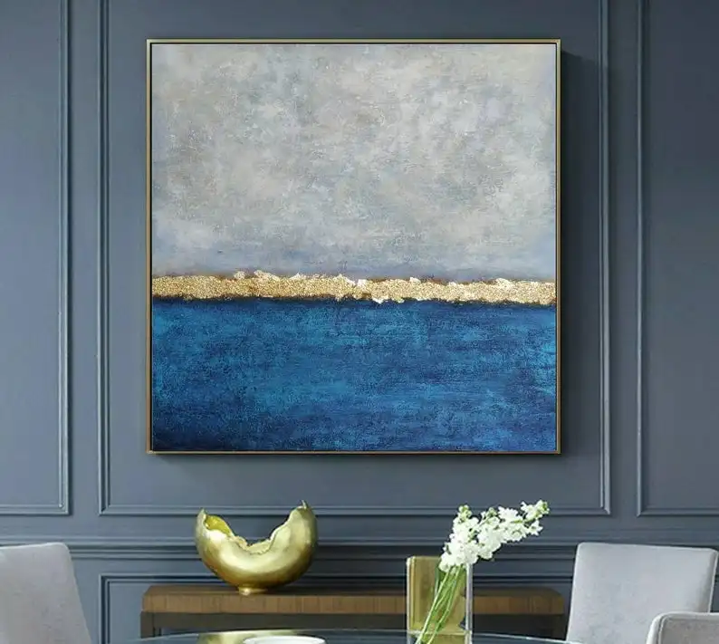 Большая картина с океаном, синяя и серая живопись, абстрактная пейзажная живопись, морская живопись на холсте, картина с золотыми листьями, декор для комнаты