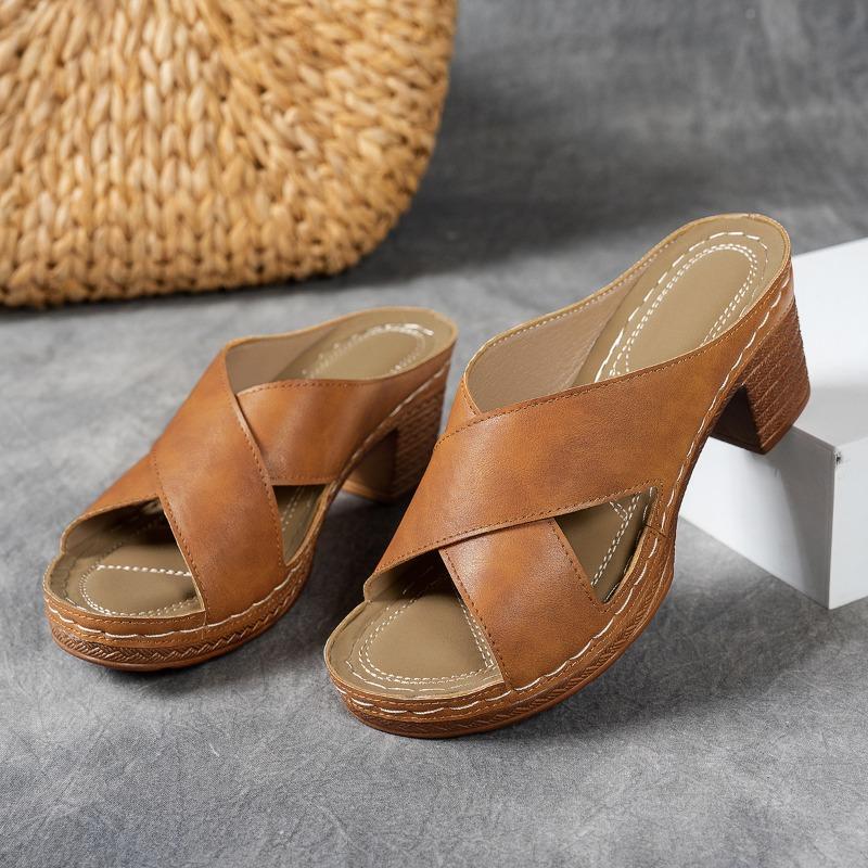 Большие размеры, С открытым носком, Шлепанцы на высоком каблуке, Женская обувь, Толстый каблук, Сандалии 43 коричневый
