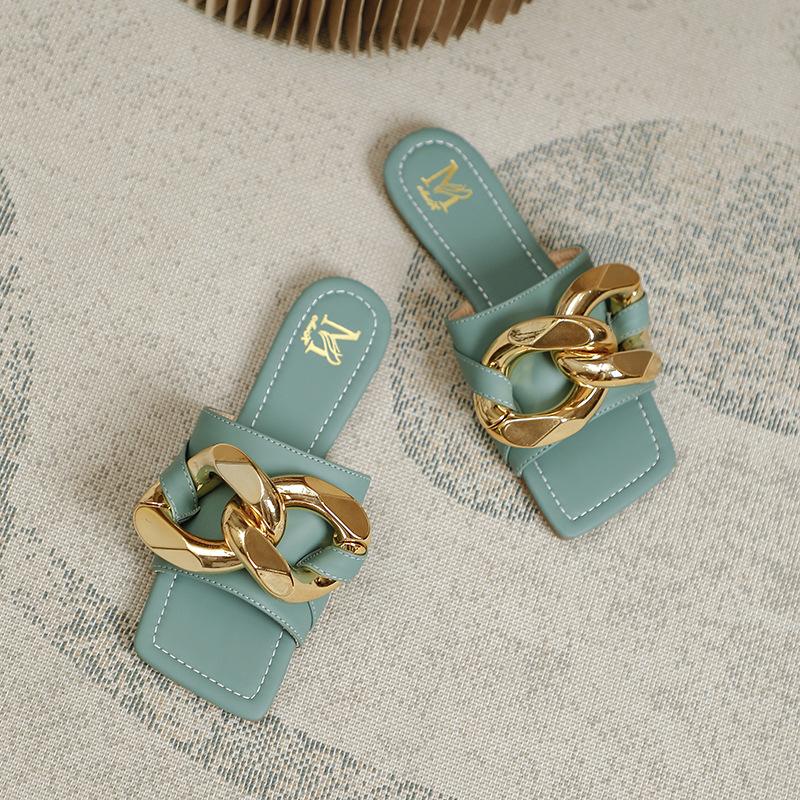Большие размеры 35-43 Женские сандалии на плоской подошве Экстравагантные шлепанцы с цепочками Пляжная обувь Женские шлепанцы с открытым носком Женские уличные домашние слайды 5 зелёный
