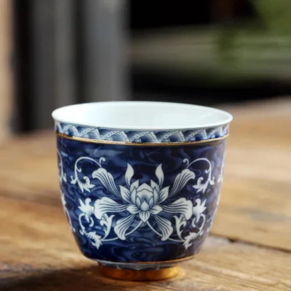 Большие эмалевые цветные чашки и тарелки с золотыми акцентами дополняют общую красоту чашки для приготовления чая из сине-белого фарфора.