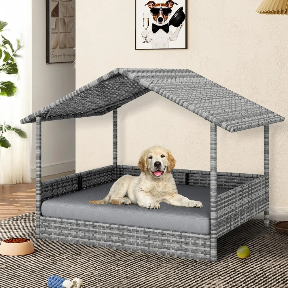 Большой плетеный домик для собак с подушкой, уличная домашняя собачья домика из ротанга, приподнятая поднятая кровать для собак с балдахином, водонепроницаемая