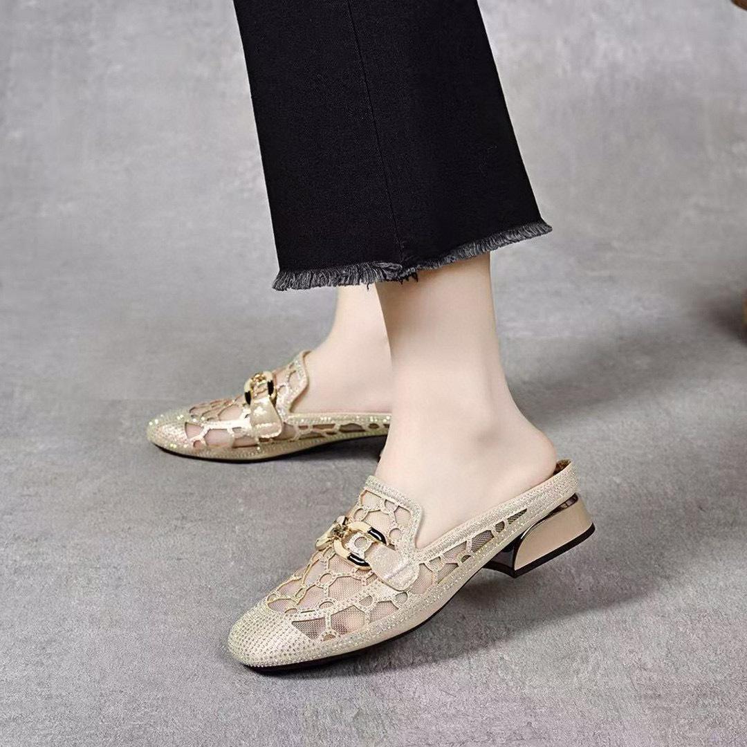 Босоножки Баотоу женские для улицы летние новые сетчатые со стразами дышащие ленивые шлепанцы на плоской подошве с низким каблуком женские полушлепанцы 40 абрикосовый