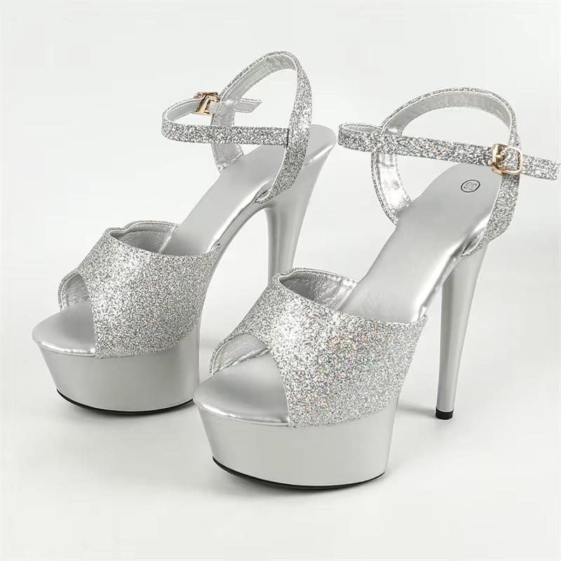 Босоножки с открытым носком из пайеток женские на экстремальной платформе со шпильками на высоком каблуке с пряжкой на ремне для танцев на шесте для выпускного вечера 41 серебряный