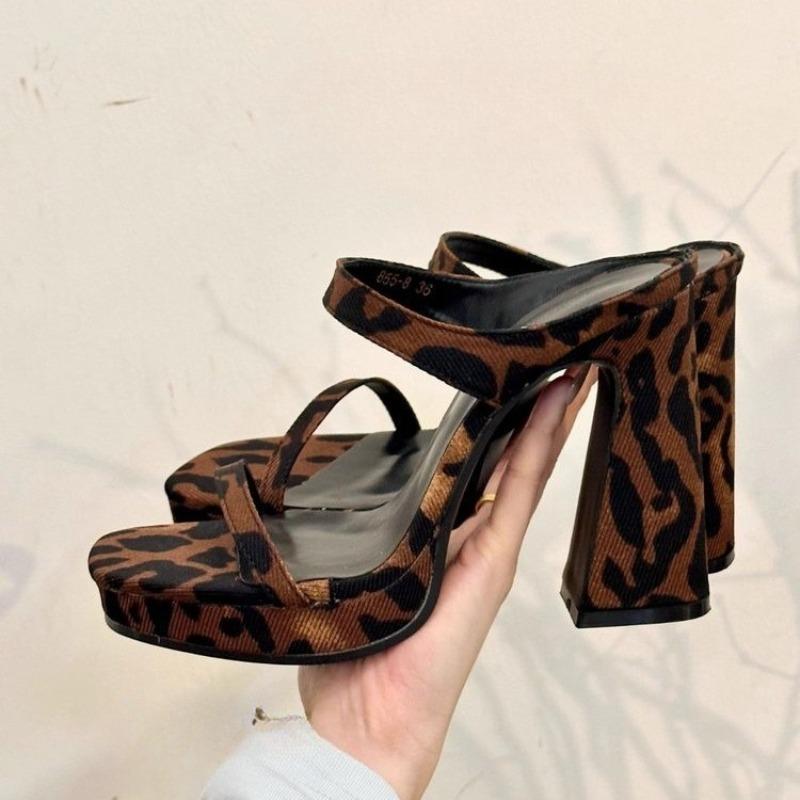 Босоножки и шлепанцы на блочном каблуке Летние Новые с квадратным носком Темпераментные На одной линии с платформой На высоком каблуке Крутые для мытья полов 41 цветной печати леопарда