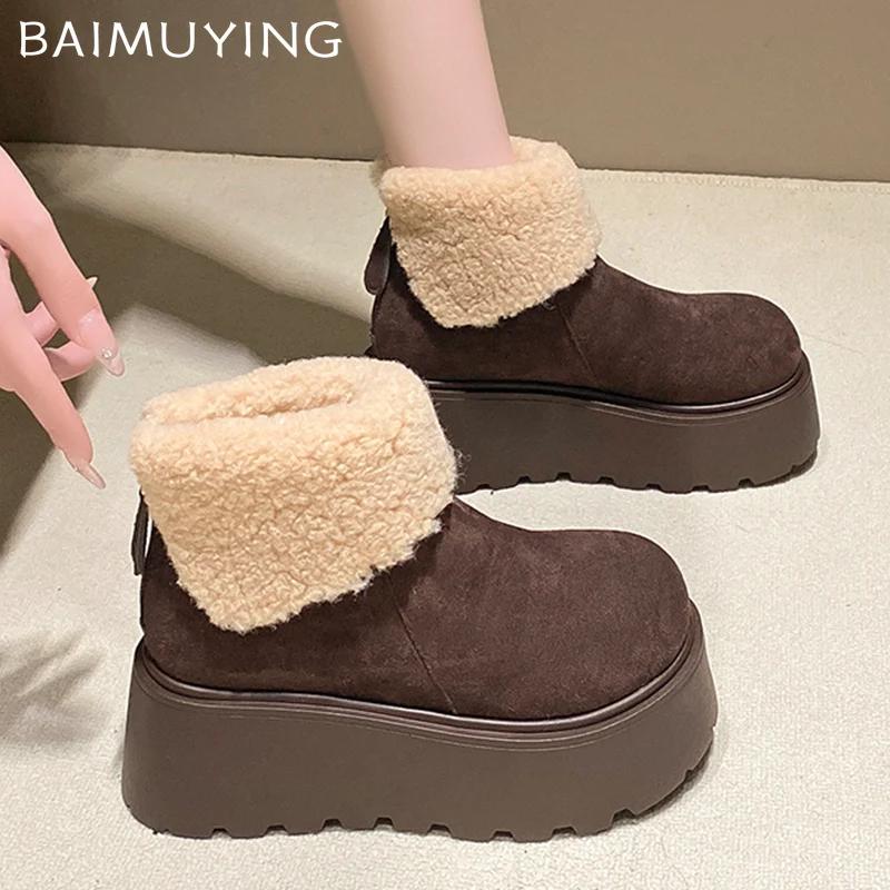 Ботильоны женские на меховой платформе, замшевые короткие, плюшевые, на среднем каблуке, хлопковые туфли, тренд 2025 года, теплая повседневная зимняя обувь, новые женские ботинки 35 чёрный
