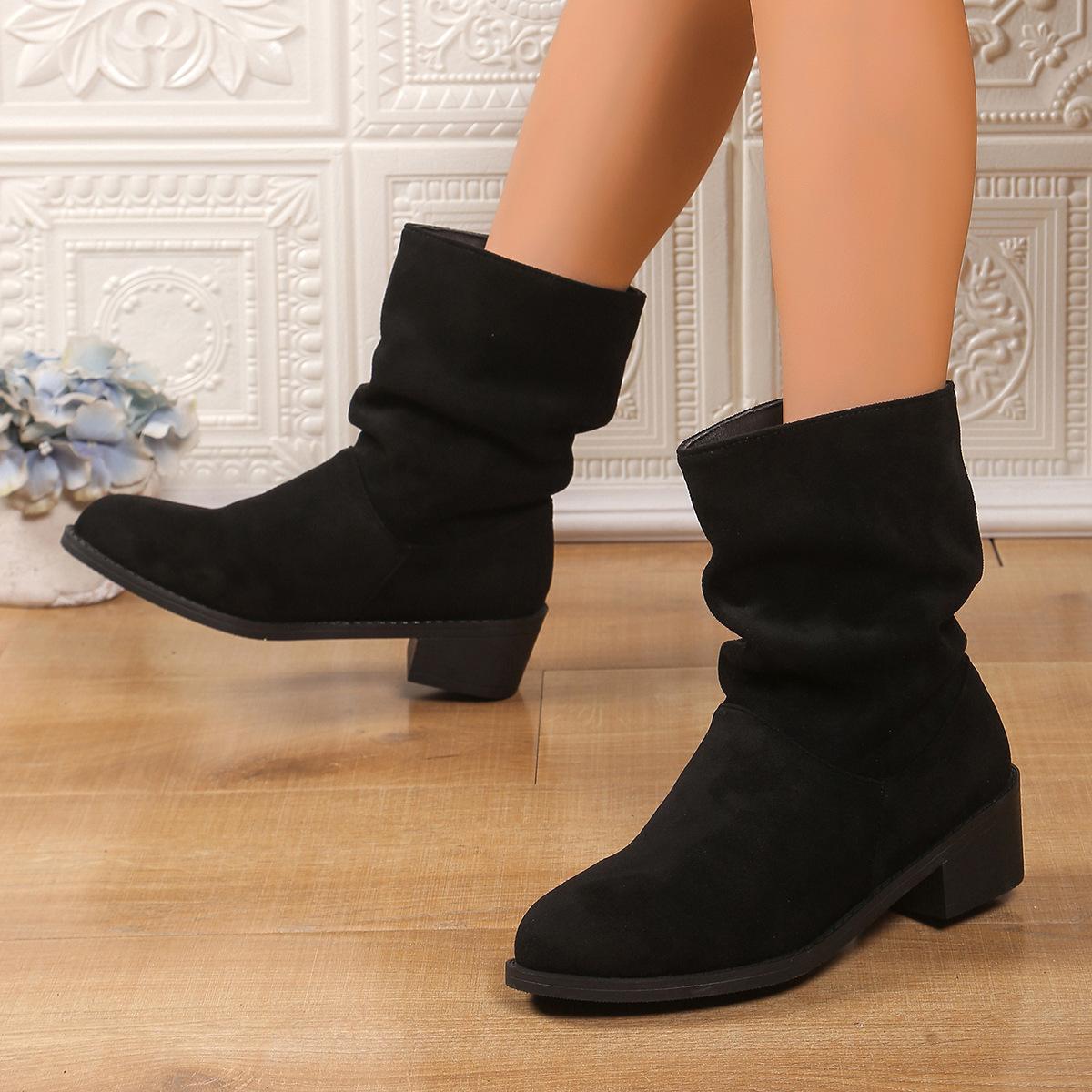 Ботильоны женские плиссированные рыцарские ботинки 2025 новые осенне-зимние плюшевые на толстом каблуке модные ботинки тонкие ботинки женские 43 чёрный