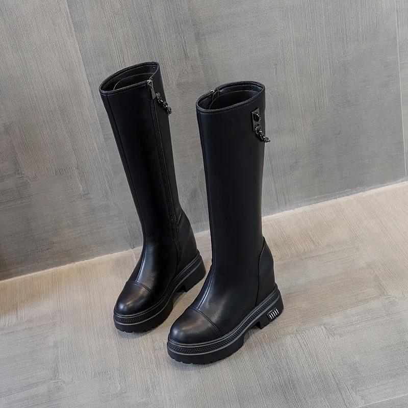Ботинки на внутренней платформе Женская обувь на платформе Новые осенне-зимние ботфорты с цепями Повседневные бархатные рыцарские ботинки Женская обувь 39 чёрный