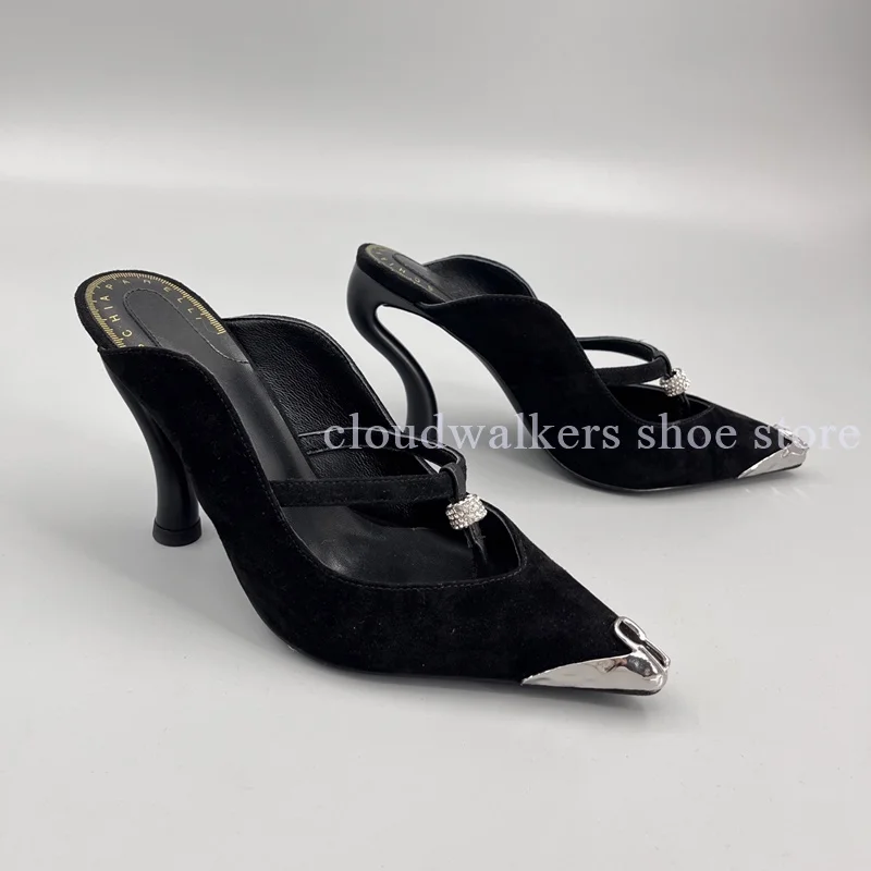 Стильные тапочки с металлической пряжкой и острым носком, изогнутые линии, неглубокий рот, перекрестный ремешок, ромбовидная пряжка, странный стиль, тапочки на каблуке