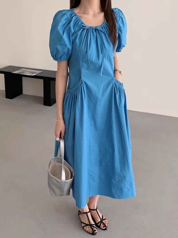 Retro Pleated Lace Up Bow Puff Sleeve Dress for Women's Summer New Korean Style Large Pocket Long Dresses
